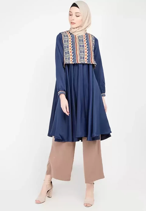 Foto: IstimewaKalau kamu bingung mau menggunakan pakaian apa, kamu bisa menggunakan tunik. Tunik adalah pakaian longgar yang bisa menutupi dada, bahu, dan punggung. Selain simpel, tunik juga terlihat sopan. Kamu bisa menggunakan hijab berwarna senada dengan tunikmu. Pilihlah tunik yang memiliki panjang sekitar lutut dengan lengan panjang, kemudian padukan dengan celana dan juga high heels.