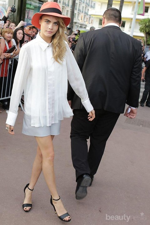 Cara Delevingne – Model asal Inggris ini jauh lebih sering terlihat mengenakan pakaian kasual dan cenderung tomboy. Namun hal itu nggak mencegahnya untuk menyulap kemeja putih menjadi outfit yang feminin. Kuncinya ada pada pemilihan model kemeja dan aksesoris. Cara memilih kemeja putih longgar dengan aksen pleats, celana pendek berwarna abu-abu, topi berwarna cerah serta high heels yang elegan.
