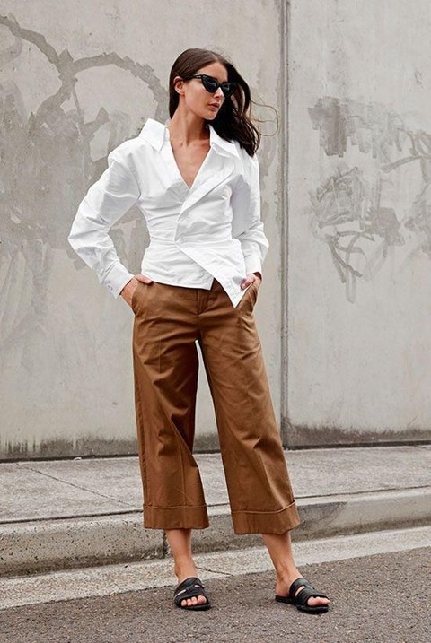 Kalau kamu memiliki celana kulot berwarna cokelat, kamu bisa memainkan perpaduan warna dengan kemeja berwarna putih dengan model wrap. Tampilan ini bisa kamu aplikasikan ketika ke kantor maupun sedang hang out.
