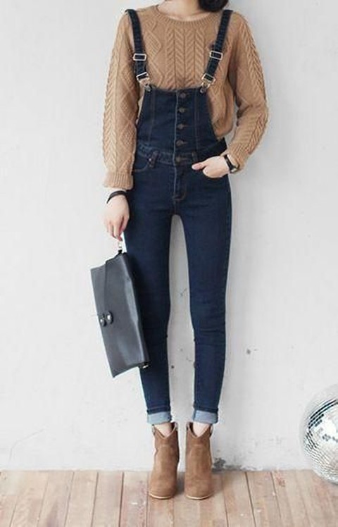 Perpaduan warna coklat susu model overall jeans dan sweater berwarna cokelat ini akan kakimu jenjang namun juga imut. Jika kamu ingin terlihat sedikit boyish, kamu bisa menggunakan boots berwarna cokelat. Namun, jika kamu ingin terlihat sporty, kamu bisa menggunakan sneakers berwarna putih.