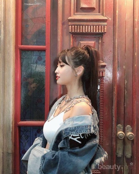 Model rambut Momo ini ngingetin kita sama Ariana Grande yah Girls! Momo terlihat sangat bold dengan rambut dan wardrobe yang dia pakai di foto ini. Tapi tetap terlihat lucu dong, image Twice tidak bisa hilang dari Momo. Warna rambut ckolat kehitaman dengan model rambut high ponytail ini bisa juga kalian gunakan ketika kalian mau datang ke kondangan. Tentunya dipadukan dengan dress yang cantik yah! Kalian pasti telihat glamour dan elegan ladies.
