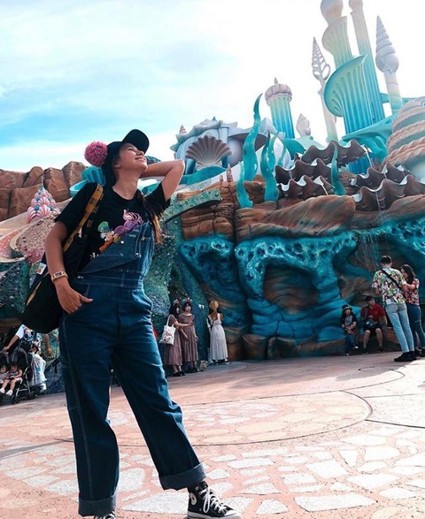 Berlibur ke Disneyland, Yuki Kato pun tampil imut dengan menggunakan kaos hitam yang dipadukan dengan jumpsuit denim sebagai outer. Yuki Kato memadukan outfitnya itu dengan sneakers dan juga topi berwarna hitam. Penampilan ini bisa kamu tiru ketika sedang berlibur bersama teman-temanmu ke taman bermain.