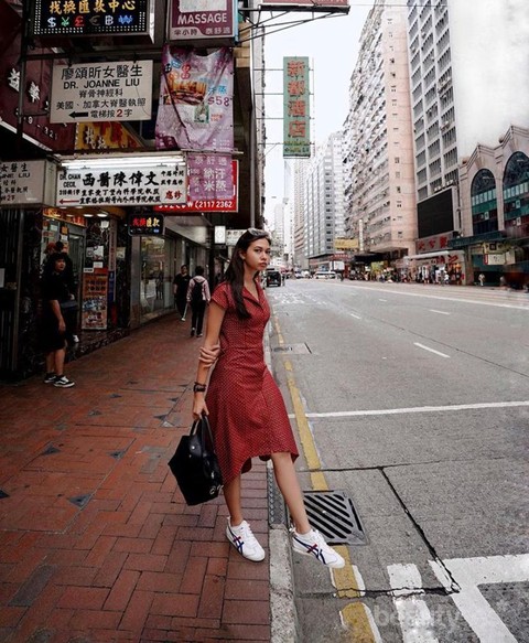 Buat kamu yang suka travelling dan ingin tampil cantik ketika jalan-jalan, bisa menggunakan dress model asimetrik seperti Yuki Kato ini. Kamu bisa memadukan dress ini dengan white sneakers untuk sedikit memberikan kesan sporty pada outfit casual-mu. Memadukan dress dengan sneakers juga merupakan salah satu gaya yang sedang hits nih, Ladies.