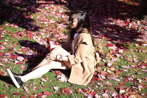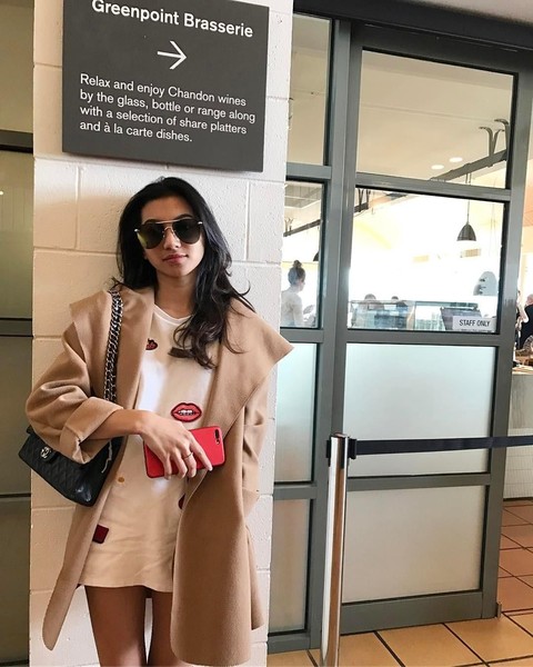 Ini dia fashion style Shakilla Astari di musim gugur! Midi coat berwarna coklat dengan tali yang diikat ke belakang dipadukan dengan t-shirt berwarna putih yang super simple. T-shirtnya enggak hanya berwarna putih polos tapi juga dihiasi patch-patch lucu. Enggak ketinggalan juga black slip on shoes dan sunglasses untuk melengkapi penampilannya!