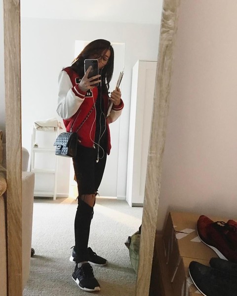 Foto: https://www.instagram.com/shakillaastari/Baseball jacket merah putih dipadukan dengan black cut knee jeans dan juga black sneakers ini jadi pilihan Shakilla untuk pergi kuliah.
