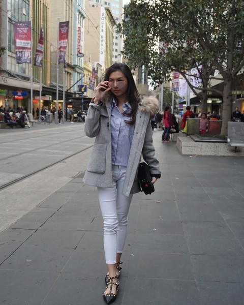Setelah fashion style musim gugur, sekarang giliran winter style ala Shakilla Astari. Fur coat warna abu-abu menjadi pilihan Shakila, dipadukan dengan kemeja biru striped dan juga skinny white pants. Sepatu yang dipilih Shakilla adalah flat shoes warna hitam dengan double strap dan detail yang terlihat glamour.