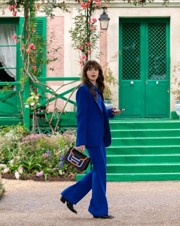 Hal ini membuktikan bahwa outfit satu warna tidak selalu menjadi hal yang membosankan. Seperti pada gambar di atas, Emily mengenakan blouse satin dengan pita berwarna biru tua dipasangkan dengan blazer dan celana flare dari Barbara Bui berwarna serupa. Aksesoris berupa boots dari Rabanne dan tas jinjing merk Pierre Hardy ikut melengkapi gaya maskulin-feminin ala Emily. Â