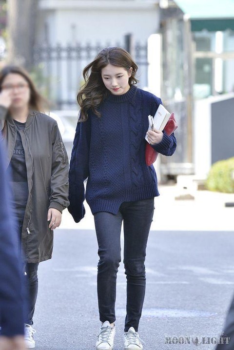 Aktris berusia 23 tahun ini nampaknya selalu tahu cara tampil keren di depan publik. Lihat saja gayanya satu ini dengan jaket kulit. Suzy menggabungkan sentuhan tomboy dan feminin dalam 1 gaya, dengan memadukan jaket kulit dan sneakers dengan dress putih. Cantik!