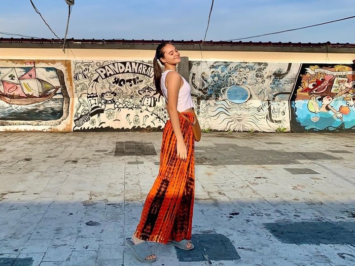 Berlibur santai anti ribet dengan celana tie dye ala Aurora juga bisa dicoba, Beauties. Saat berjalan di salah satu wilayah di Yogyakarta, Aurora menyusuri jalanan Kota Istimewa dengan menggunakan atasan tank top putih serta kulot tie dye berwarna orange hitam. Kelewat santai, dengan tampilan bare face ia hanya menggunakan sandal hotel.
