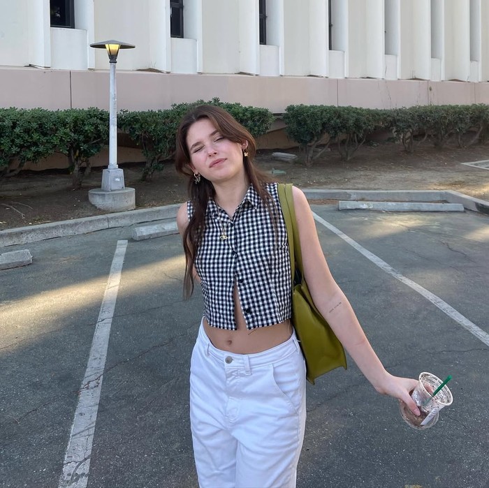 Crop top tanpa lengan dengan motif kotak-kotak hitam putih adalah pilihan pas untuk tampilan yang kasual namun tetap modis. Motifnya yang klasik memberikan sentuhan chic, sementara potongan crop menambahkan kesan trendi dan segar, cocok untuk aktivitas santai di siang hari.