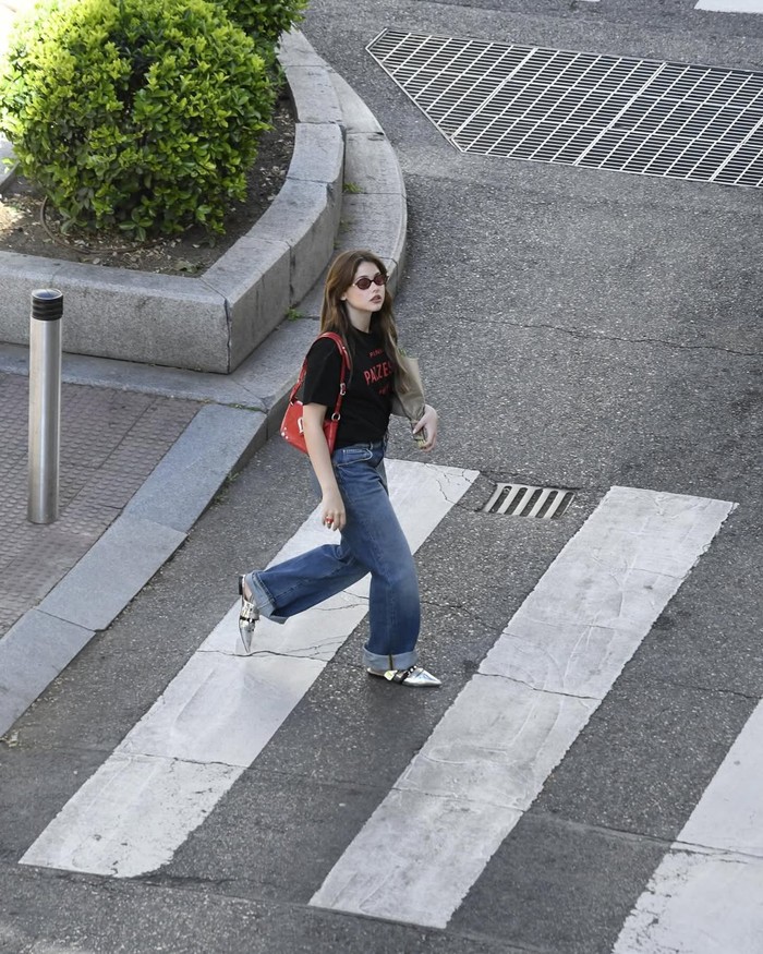 Untuk menambah sentuhan menarik pada outfit ini, tambahkan tas merah yang mencolok. Sementara pointed-toe mules silver menambah kesan elegan dan sedikit glamour pada tampilan yang kasual.