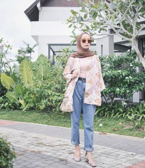 Masih menggunakan jeans, Joyagh kini tampil kece memadukan outer motif berwarna peach dengan menggunakan atasan warna senada. Selain itu, wanita imut ini memilih menggunakan hijab berwarna cokelat dengan kacamata orange yang semakin menyempurnakan gayanya.
