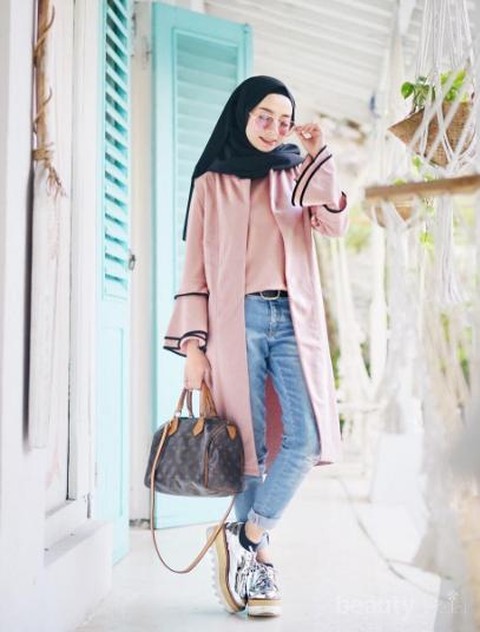 Kali ini Joyagh sukses memadu padankan long outer berwarna pink dengan model flare pada bagian tangannya. Ia kemudian mengombinasikan dengan celana jeans dengan atasan dengan warna yang senada dengan outer. Untuk hijab, Joyagh memilih menggunakan warna hitam dengan sepatu berwarna silver.