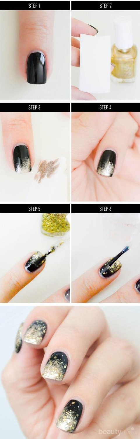 Cukup menggunakan dua warna cat kuku, kamu bisa mendapatkan hasil nail art yang menawan seperti gambar di bawah ini. Perpaduan warna hitam dan emas akan menambah keanggunan di hari spesialmu. Bagi wanita hijabers, kamu bisa menggunakan cat kuku yang bisa dipakai untuk berwudhu.