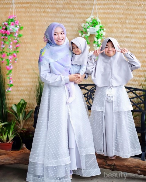 Warna lembut dan detail bordir yang elegan membuat Angie terlihat menawan dan elegan dengan outfit syar'i ini.