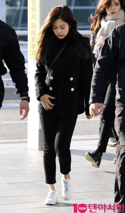 Lalu Jennie yang kembali dari Paris ke Incheon pada tanggal 7 Maret 2019 mengenakan kemeja putih dan celana lebar hitam. Simple dan tetap stylish.