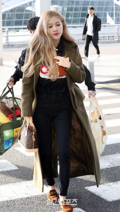 Lalu penampilan Rosé juga tak kalah stylish dengan long coat warna olive dan loaf coklatnya. Main vocal yang satu ini memang selalu tampil kece, ya, Ladies?