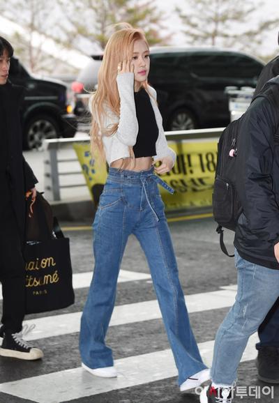 Pencinta cropped top, Rosé, akhirnya tampil mengenakan style kesukaannya itu dengan high-waisted jeans dengan nuansa vintage.