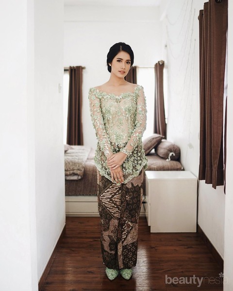 Kebaya kerah sabrina dengan warna lime cocok untukmu yang ingin terlihat kalem. Hiasan payet berupa mutiara dan bunga membuatmu terlihat semakin anggun dan eye catching. Untuk mempermanis tampilanmu, cukup gunakan tatanan rambut berupa sanggul dan anting jenis stud.