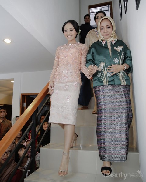 Ingin tampil elegan dengan kebaya klasik? Kamu bisa lho menggunakan kebaya berwarna nude lengan panjang berkancing depan dengan hiasan payet berbentuk bunga 3D. Untuk aksesori, kamu bisa gunakan anting jenis cluster. Agar lebih seimbang, buat tatanan sanggul yang sederhana dan sematkan bunga peach. Elegan!