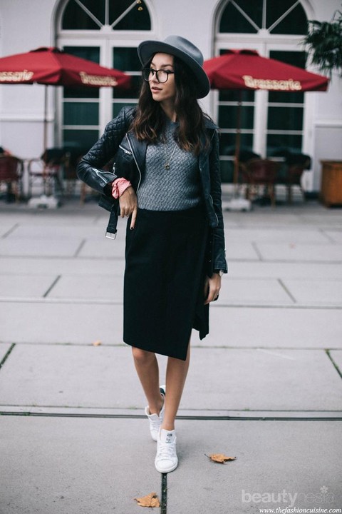 Tips mix and match dengan rok hitam yang pertama adalah dengan gaya midi skirt berpotongan asimetris ini cocok buat kamu yang enggak terlalu menyukai rok terlalu ketat. Inspirasi OOTD untuk nonton konser ini bisa kamu tiru lho, ladies. Padanan jaket kulit hitam ditambah topi fedora yang membuat look kamu makin edgy dan stylish.