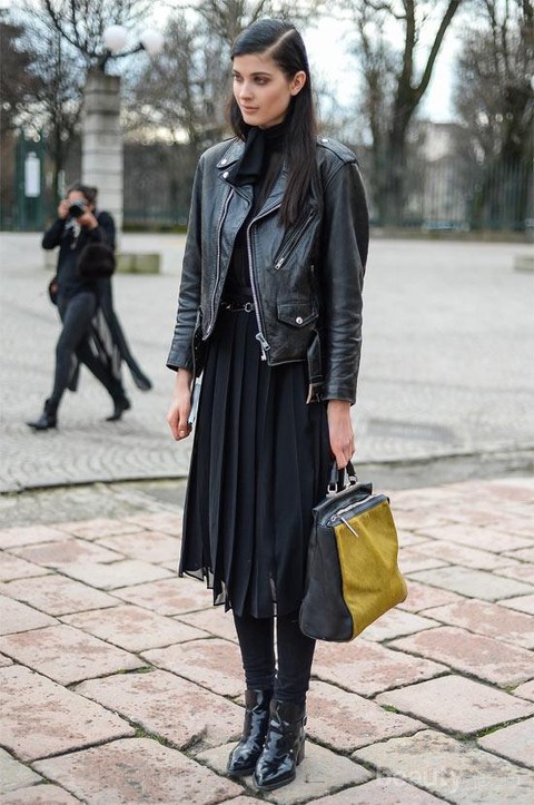 Tips mix and match dengan rok hitam dengan jaket kulit lainnya adalah dengan memadu padankannya dengan rok accordion atau yang biasa kita sebut rok rempel. Gaya OOTD ini cukup santai dan nyaman untuk dipakai menonton konser. Selain itu gunakan sepatu boots yang membuat nyaman meskipun berdiri berjam-jam.