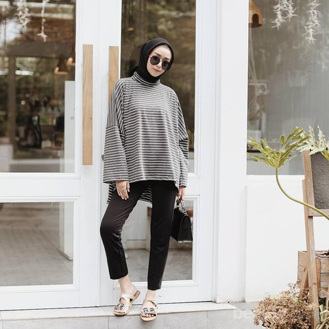 Bagi kamu yang ingin tampil simple, bisa banget contek gaya yang satu ini. Kamu bisa memadukan celana hitam yang berpotongan lurus dengan atasan bermodel batwing, juga penggunaan hijab dengan gaya dililitkan ke belakang. Hal ini akan membuat penampilan kamu terlihat lebih santai namun tetap keren. Baju dengan motif stripe seperti ini juga akan membuat badan kamu tidak terlihat gemuk, apalagi celana dengan potongan lurus seperti ini akan memberikan kesan yang ramping bagi pemakainya