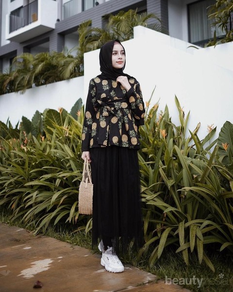Bagi kamu yang memang sangat menyukai warna-warna netral, namun ingin tampilan kamu terlihat feminim, kamu bisa memakai rok tutu yang dipadukan dengan wrap blouse bermotif nanas agar terlihar lebih playful dan juga segar. Kamu bisa menambahkan hijab berwarna hitam yang akan membuat penampilan kamu terlihat sangat manis.