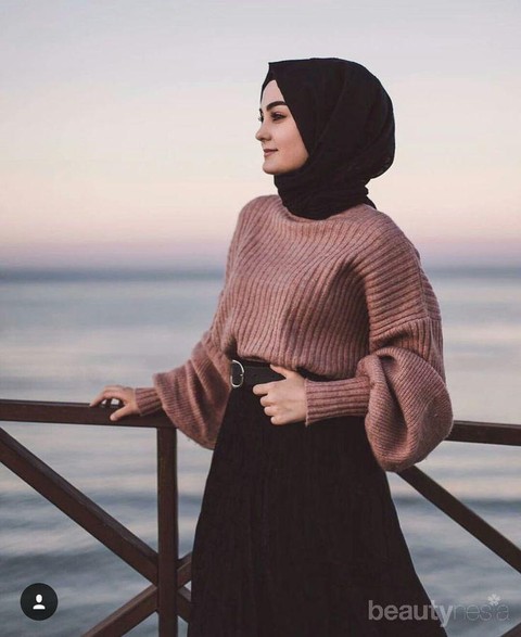 Identik dengan over size sweater, pleated skirt, sampai boyfriend jeans, menjadikan Korean Style menjadi sangat beragam. Salah satu gaya korea yang bisa teman hijabers jadikan inspirasi adalah perpaduan antara over size sweater dengan model turtle neck dengan midi skirt berwarna cerah seperti ini. Jika roknya terlihat cingkrang, kamu bisa memakai legging ataupun stocking tebal untuk dalaman. Tambahkan high sneakers dan kalung sebagai pemanis tampilanmu ya!