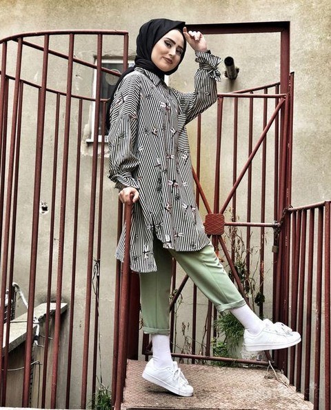 Nah, kalau kamu merupakan pecinta fashion yang girly dan feminine, gaya fashion hijab dengan padu padan sneakers yang satu ini wajib kamu coba. Kamu hanya perlu menggunakan dress 7/8 yang disandingkan dengan skinny pants kamu. Tampilan hijab casual dengan sneakers yang ini dijamin akan tetap membuat kamu anggun dan feminine.