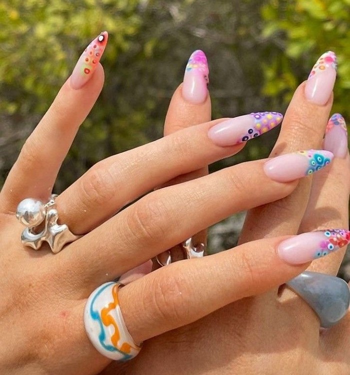 French manicure klasik ini lebih berani dengan ujung kuku berwarna pastel cerah seperti merah muda, ungu, biru, dan kuning, yang diaplikasikan secara tidak beraturan untuk menciptakan efek ombre yang lembut. Tambahan dot-dot kecil berwarna cerah serta pola abstrak seperti garis lengkung atau oval memberikan kesan playful.