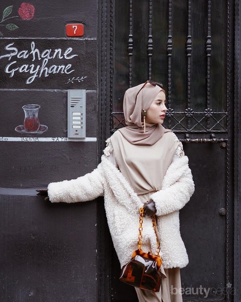 Kalau sedang liburan ke luar negeri di musim dingin, bisa menjajal gaya Aghnia Punjabi seperti di foto ini. Penampilan serba coklat, mulai dari coat, top hingga pashmina, dilengkapi dengan drop earrings cantik dengan tassel dengan warna senada.