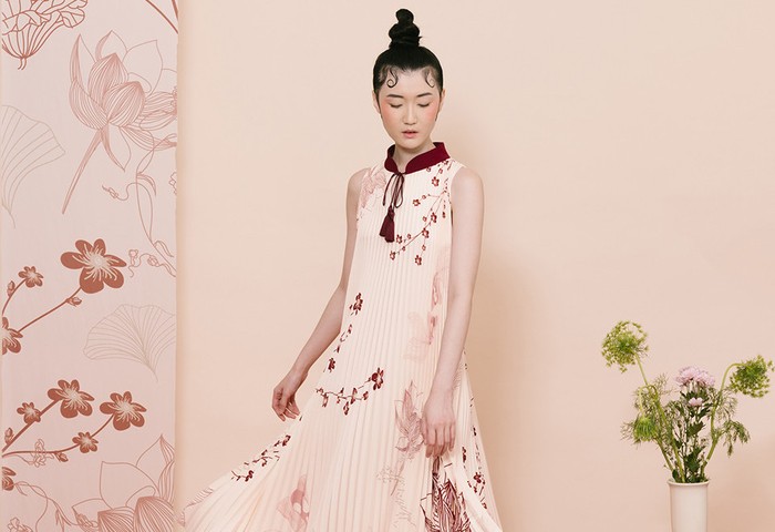 Pleated dress dengan desain cantik berikutnya tersedia dalam rak Claude. Cetakan bunga pada material twill terlihat semakin flattering dengan kombinasi elemen cheongsam, yakni kerah shanghai yang disematkan tassels sebagai penghias.
