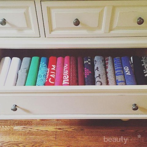 Trik satu ini khusus kamu yang menyimpan baju di dalam lemari laci. Untuk efektivitas pemakaian ruang dan mempermudah pencarian, kamu bisa menyimpang kaos atau berbagai bajumu dengan cara digulung seperti ini. Dengan begitu saat mengambil baju, kamu tidak perlu membongkar ataupun mengangkat-angkat baju yang tertumpuk. Tinggal ambil lalu tutup kembali lacinya deh!
