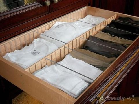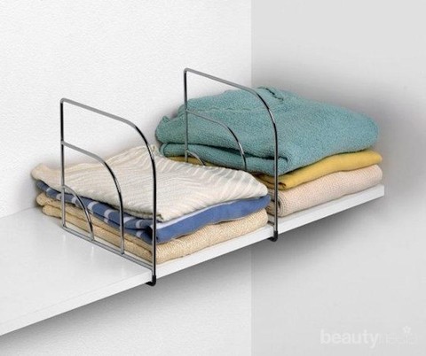 Bagian lemari yang kamu gunakan untuk menyimpan baju terlipat memang sekarang terlihat rapi, tapi tidak menutup kemungkinan besok sudah berantakan lagi karena kamu sibuk membongkar dan mencari baju untuk pergi, Untuk menghindari hal tersebut, kamu bisa tambahkan sekat portabel. Dengan begini, kamu bisa membagi baju berdasarkan jenisnya (misalnya kaos atau blus) dan mempermudah pencarian baju. Trik ini bisa juga kamu terapkan pada lemari laci.