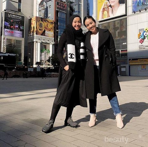 Dengan kompak menggunakan warna outfit hitam dan hitam, Bella bersama dengan sahabatnya ini bergaya di depan kamera seperti street model di Tokyo yah ladies. Syal Channel yang Bella gunakan menambah manis penampilannya di foto ini.