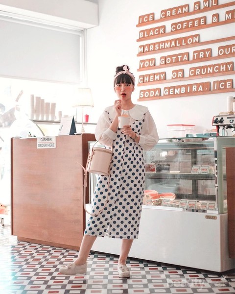 Foto: IstimewaKamu juga bisa bergaya cute dengan menggunakan two piece outfit. Inner berupa blouse berwarna putih dengan dress sebagai outer bermotif polkadot membuat gaya kamu semakin stunning dan vintage abis.