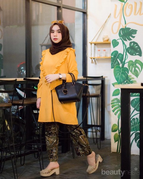 Jangan cuma nyaman memakai outfit berwarna netral aja. Sesekali, boleh kok memakai outfit dengan warna cerah dan keluar dari comfort zone. Untuk kamu yang menyukai feminine look, coba pakai ruffle tunik berwarna tangerine seperti Nabila Tarmuzi yang satu ini. Kenakan bersama celana bermotif warna netral seperti cokelat atau hitam. Tunik yang berukuran panjang akan menutupi bentuk tubuhmu, cocok banget untuk kamu yang kurang percaya diri dengan bentuk bokong atau paha.