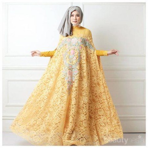 Buat kamu hijabers yang juga bingung mencari baju pesta apa yang bisa bikin kamu anggun tapi tetap pada syariat Islam, yaitu tidak mengenakan gaun yang ketat, nah kamu bisa memilih untuk menggunakan cape dress brokat berikut ini. Kombinasi warna kuning dan abu-abu pada bagian dada, bikin penampilan kamu terlihat mewah. Supaya tampil matching, jangan lupa untuk mengguakan hijab berwarna abu-abu yang senada dengan warna di bagian dada dress-nya ya, Ladies!