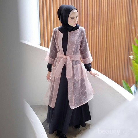 Ladies, kamu bisa lho mengenakan outer yang transparan dengan model seperti ini namun tetap tak terlihat berlebihan. Yup, asalkan jangan lupa untuk memadukannya dengan inner yang tepat ya, misalnya dress hitam panjang dengan model A line seperti ini, agar tetap tidak membentuk badan meskipun dengan outer transparan. Look seperti ini nampaknya cocok untuk kamu kenakan ke pesta. Mau coba?