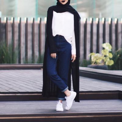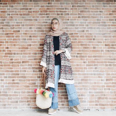 Untuk kamu yang memiliki outer panjang hijab bermotif cenderung ramai atau full pattern long outer, pilihlah atasan polos agar tidak terlihat mencolok. Apabila memang kamu ingin menonjolkan outer panjang dalam lookmu, pilih atasan berwarna gelap atau netral seperti putih, hitam atau cokelat dan abu-abu.