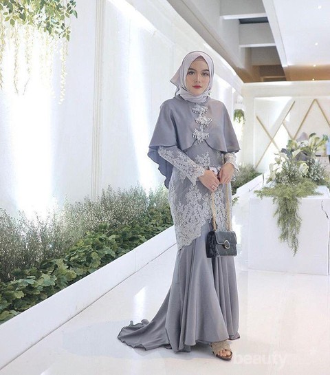 Foto: IstimewaIa tampak tampil dengan kebaya modern yang memadukan beberapa kain dengan bahan yang berbeda. Pada bagian atasnya yaitu di bagian pundak, kebaya tersebut tampak menggunakan kain berbahan satin polos yang menjuntai indah kebawah menutup bagian dada dari kebaya yang ia gunakan. Dibawah kain satin berwarna grey tersebut, terdapat kain brukat super tipis berwarna grey sangat muda bahkan sudah mendekati warna putih.