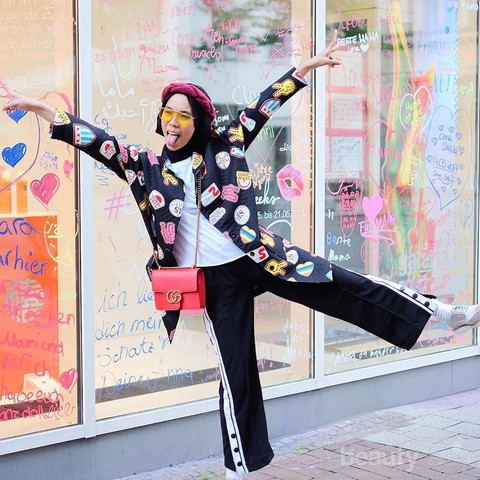 Iymel memang dikenal sebagai salah satu selebgram yang cenderung bergaya nyentrik. Kali ini pemilik akun Instagram @iymel ini memadupadankan jacket lucu bermotif dengan t-shirt putih. Ia kemudian mengombinasikannya dengan sporty pants warna hitam.