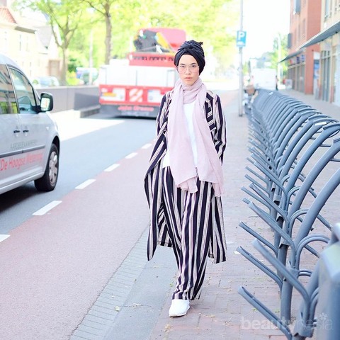 Kali ini selebgram hijab, Iymel bergaya monokrome dengan menggunakan outfit serba striped mulai dari pants hingga outer. Iymel mengombinasikan dengan t-shirt serta sneakers putih. Untuk hijab, Iymel memilih menggunakan turban hitam yang kekinian banget. Buat kamu yang ingin tampil beda saat traveling maupun hangout, kamu bisa banget mencotek gaya Iymel ini ya ladies.