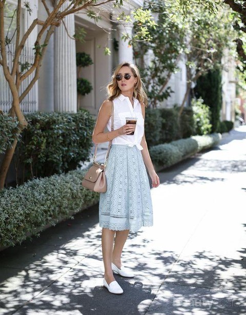 Sesudah warna gelap, jangan lupakan juga warna-warna cerah dan lucu seperti warna baby blue atau biru pastel. Rok midi berwarna biru ini bisa kamu padukan dengan atasan dan sepatu berwarna putih. Trik yang bisa kamu coba agar penampilanmu enggak gitu-gitu aja, coba ikat bagian bawah kemejamu (seperti pada gambar berikut) untuk menciptakan ilusi atasan crop top.