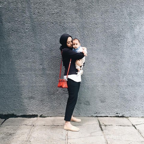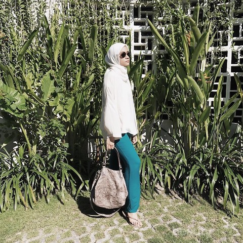Artis muda yang kini sudah memiliki satu orang anak ini memang dikenal dengan gayanya yang cenderung simpel namun tetatp terlihat stylish. Kali ini Ayudia tampil dengan gaya hijab kasual yang sangat santai yaitu hanya dengan memadupadankan kemeja putih dengan celana warna tosca serta flip flop. Ia kemudian menambahkan shoulder bag serta hijab warna putih sebagai pelengkapnya.