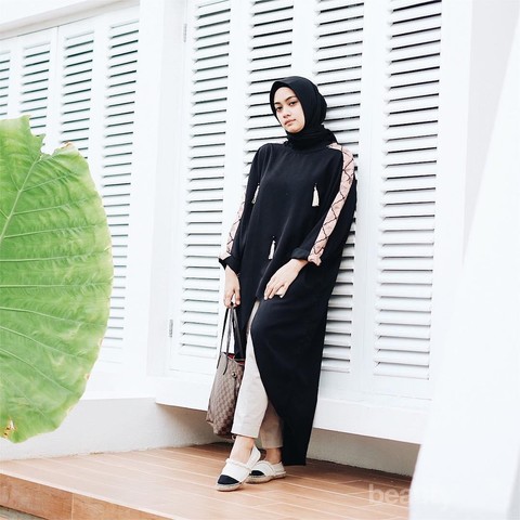 Kini Ayu tampil kece dan bergaya anak muda banget menggunakan long outer warna hitam yang dipadukan dengan celana panjang warna cream. Ia memilih untuk menggunakan inner hitam serta hijab segiempat dengan warna yang senada dengan outer dan juga inner-nya. Slip on shoes ia pilih untuk melengkapi penampilannya.