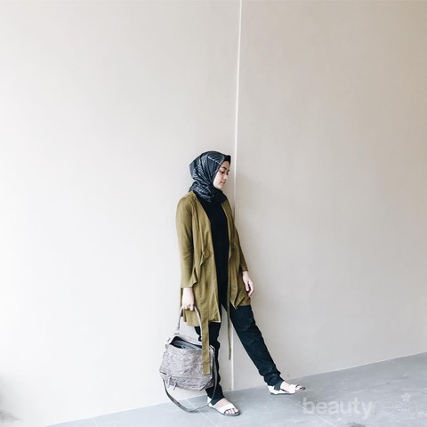 Kali ini pemilik akun Instagram @ayudiac ini tampil santai banget dengan mengombinasikan outer warna army dengan celana panjang hitam dan t-shirt dengan warna senada. Agar penampilannya semakin kece, Ayudia memilih menggunakan sandal flat sebagai alas kakinya dan hijab motif yang cantik.