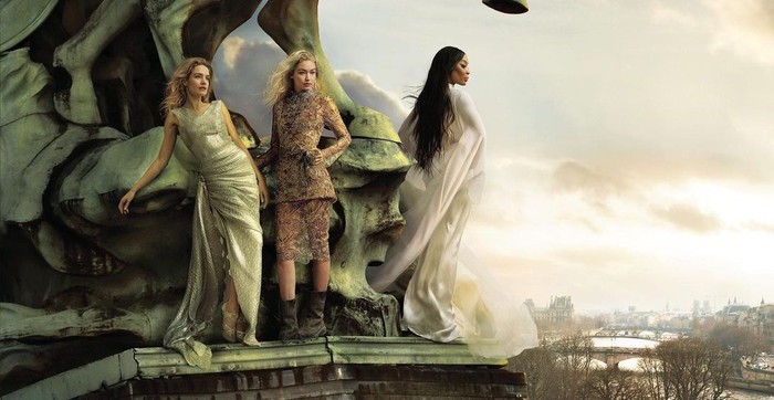 ![]() Gigi Hadid berbalut busana Gucci terinspirasi Lagerfeld/ Foto: instagram.com/voguemagazine/Annie Leibovitz |