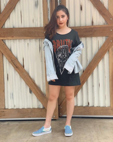 Foto: https://www.instagram.com/p/By143XKlaQK/?utm_source=ig_web_copy_linkBaju kebesaran memang bisa menjadi fashion utama untuk kamu yang memiliki tubuh mungil seperti Prilly, Ladies. Keluarkan kaus kebesaran milik kakakmu, adikmu, atau kekasihmu lalu gunakan, jadi seperti dress, deh. Prilly menambahkan jaket jeans dengan sepatu keds yang membuat penampilannya terlihat fresh.